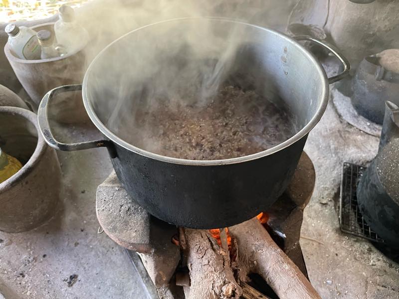 煮炊きはかまどで火を起こしてやる。